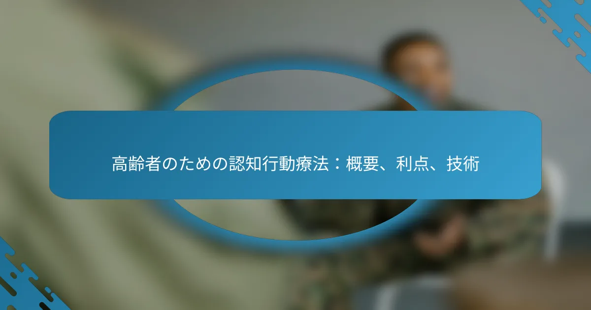 認知行動療法(CBT)は、精神的健康の課題に直面している高齢者にとって重要な利点を提供します。この記事では、CBTが不安や抑うつにどのように対処するか、主な利点を強調し、高齢者向けの特別な技術を概説します。また、CBTの効果を高める稀な特性についても検討し、個別化された治療計画の重要性について議論します。 高齢者のための認知行動療法とは何ですか? 高齢者のための認知行動療法(CBT)は、構造化された目標指向の技術を通じて精神的健康の問題に対処することに焦点を当てています。これは、高齢者が否定的な思考パターンを変えることによって、不安、抑うつ、認知の低下を管理するのを助けます。主な利点には、感情の調整の改善、対処戦略の強化、全体的な幸福感の向上が含まれます。高齢者向けのCBTでよく使用される技術には、認知の再構築、行動の活性化、マインドフルネスの実践が含まれ、年齢に関連する課題に対応するように調整されています。 従来の療法方法とどのように異なりますか? 高齢者のための認知行動療法(CBT)は、構造化された目標指向の技術を強調することで従来の療法方法と異なります。従来の方法が過去の経験を探求することに焦点を当てるのに対し、CBTは現在の思考パターンと行動をターゲットにして即時の変化を促進します。このアプローチは、高齢者のクライアントに特に有益であり、対処メカニズムを強化し、メンタルヘルスの結果を改善することができます。さらに、CBTは通常、期間が短いため、効果的な治療を求める高齢者にとってよりアクセスしやすくなっています。 認知行動療法の主な原則は何ですか? 高齢者のための認知行動療法(CBT)は、否定的な思考パターンと行動を修正することに焦点を当てています。主な原則には、認知の再構築、行動の活性化、問題解決スキルが含まれます。これらの技術は、メンタルヘルスを改善し、対処戦略を強化し、レジリエンスを育むのに役立ちます。CBTは、思考、感情、行動の関係を強調し、メンタルウェルビーイングへの積極的なアプローチを促進します。 高齢者のための認知行動療法の普遍的な利点は何ですか? 認知行動療法(CBT)は、高齢者にとって重要な利点を提供し、メンタルヘルスの改善、対処スキルの強化、不安や抑うつの症状の軽減を含みます。CBTは、高齢者が否定的な思考パターンに挑戦することを可能にし、感情的なレジリエンスを育みます。研究によると、CBTは行動や思考プロセスに持続的な変化をもたらし、全体的な幸福感を促進することが示されています。さらに、CBTは悲しみ、喪失、慢性疾患などの年齢に関連する問題にも対処し、汎用性のある治療アプローチとなっています。 どのようにメンタルヘルスの結果を改善しますか? 認知行動療法(CBT)は、否定的な思考パターンに対処することによって、高齢者のメンタルヘルスの結果を大幅に改善します。対処戦略を強化し、不安や抑うつの症状を軽減します。研究によると、CBTは高齢者の抑うつ症状を50%減少させることができます。CBTの構造化されたアプローチは、高齢者がレジリエンスを発展させ、全体的な生活の質を改善するのに役立ちます。 不安や抑うつにどのような影響を与えますか? 認知行動療法(CBT)は、高齢者の不安や抑うつを大幅に軽減します。否定的な思考や行動を管理するための実用的な技術を提供し、感情の調整を促進します。研究によると、CBTは多くの高齢患者の症状を50%改善することが示されています。この療法の構造化されたアプローチは、対処メカニズムとレジリエンスを強化し、メンタルヘルスサポートの貴重なツールとなります。 どのように対処戦略を強化できますか? 認知行動療法(CBT)は、高齢者のためにストレスや不安を管理するための構造化された技術を提供することによって、対処戦略を強化します。これは、個人が否定的な思考パターンを特定し、それを肯定的なものに置き換えることを可能にします。このアプローチは、感情の調整とレジリエンスの向上につながります。研究によると、CBTは高齢者の抑うつ症状を大幅に軽減し、より大きなコントロール感と幸福感を育むことが示されています。高齢者に実用的なツールを提供することによって、CBTは彼らが人生の課題を効果的に乗り越える能力を強化します。 高齢者のための認知行動療法で使用されるユニークな技術は何ですか? 高齢者のための認知行動療法は、特定のニーズに合わせたユニークな技術を採用しています。これらの技術には、否定的な思考パターンに挑戦するのを助ける認知の再構築や、楽しめる活動への参加を促す行動の活性化が含まれます。感情の調整を高めるためにマインドフルネスの実践も統合されています。さらに、セラピストは、気分や自己評価を改善するためにポジティブな思い出を育む回想療法を使用することがあります。これらの方法は、全体的に高齢者のメンタルウェルビーイングとレジリエンスを促進します。 ど