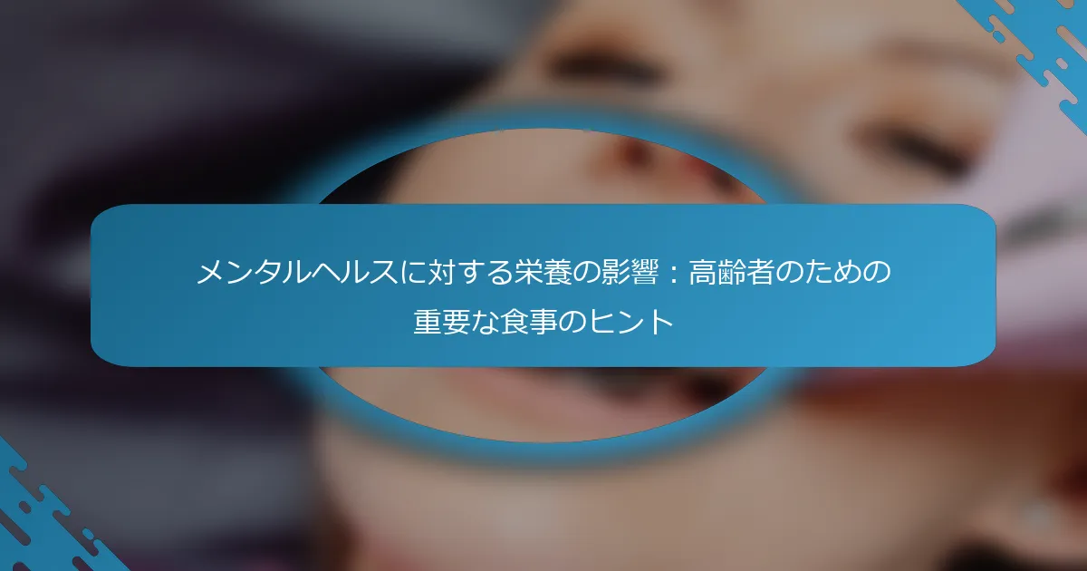 栄養は、高齢者のメンタルヘルスにおいて重要な役割を果たします。バランスの取れた食事は、認知機能を向上させ、うつ病のリスクを減少させ、全体的な幸福感を改善します。オメガ-3脂肪酸、抗酸化物質、ビタミンが豊富な栄養価の高い食品に焦点を当てましょう。水分を十分に摂取し、地中海式ダイエットのような食事パターンを守ることで、メンタルの明瞭さと気分の安定をさらにサポートできます。 栄養は高齢者のメンタルヘルスにどのように影響しますか? 栄養は、高齢者のメンタルヘルスに大きな影響を与え、脳機能を支えるための必須栄養素を提供します。オメガ-3脂肪酸、抗酸化物質、ビタミンが豊富なバランスの取れた食事は、認知能力を向上させ、うつ病のリスクを減少させることができます。 例えば、脂肪の多い魚、ベリー、葉物野菜は、神経保護を促進し、気分を改善する独自の特性を持っています。研究によると、これらの栄養素が豊富な食事は、認知機能の低下率が低いことと相関しています。 さらに、水分補給は、メンタルの明瞭さにおいて重要な役割を果たします。脱水症状は混乱や苛立ちを引き起こす可能性があり、適切な水分摂取の重要性を強調しています。 これらの食事戦略を取り入れることで、高齢者のメンタルヘルスの改善につながり、より良い生活の質を促進します。 認知機能に必要な必須栄養素は何ですか? 認知機能に必要な必須栄養素には、オメガ-3脂肪酸、抗酸化物質、ビタミンB、D、E、マグネシウムや亜鉛などのミネラルが含まれます。オメガ-3脂肪酸は脳の構造と機能を支え、抗酸化物質は酸化ストレスから保護します。Bビタミンはエネルギー生産と神経伝達物質の合成に不可欠です。ビタミンDは気分の調整に影響を与え、マグネシウムは認知プロセスを支えます。これらの栄養素を適切に摂取することで、メンタルの明瞭さを向上させ、高齢者の長期的な認知健康を支えることができます。 脳の健康にとって重要なビタミンはどれですか? 脳の健康にとって重要なビタミンには、Bビタミン、ビタミンD、ビタミンEがあります。特にB6、B12、葉酸は認知機能を支え、認知症のリスクを減少させます。ビタミンDは気分の調整や認知パフォーマンスに関連しています。ビタミンEは抗酸化物質として作用し、脳細胞を酸化ストレスから保護します。 オメガ-3脂肪酸はメンタルウェルビーイングをどのようにサポートしますか? オメガ-3脂肪酸は、炎症を減少させ、脳の健康をサポートすることでメンタルウェルビーイングを向上させます。これらは、うつ病や不安の発生率を低下させることに関連しています。研究によると、オメガ-3の摂取量が多い人は、気分や認知機能が改善されることが示されています。これらの脂肪酸は主に魚、亜麻仁、くるみに含まれており、バランスの取れた食事にとって不可欠です。 水分補給はメンタルの明瞭さにどのような役割を果たしますか? 水分補給は、認知機能を改善することでメンタルの明瞭さを大幅に向上させます。適切な水分摂取は脳の健康を支え、集中力や記憶の保持を促進します。脱水症状は疲労、混乱、注意力の低下を引き起こす可能性があります。研究によると、軽度の脱水でも認知パフォーマンスが損なわれることが示されており、最適なメンタル機能のために適切な水分レベルを維持する重要性が強調されています。 メンタルヘルスの改善に関連する一般的な食事パターンは何ですか? メンタルヘルスの改善に関連する一般的な食事パターンには、地中海式ダイエット、植物ベースの食事、オメガ-3脂肪酸が豊富な食事が含まれます。地中海式ダイエットは、果物、野菜、全粒穀物、健康的な脂肪を重視しており、これらは認知機能を支えます。植物ベースの食事は、栄養密度を通じて炎症を減少させ、メンタルウェルビーイングを促進します。魚や亜麻仁に含まれるオメガ-3脂肪酸は、うつ病や不安の発生率を低下させることに関連しています。これらの食事パターンは、必須栄養素を提供し、バランスの取れたライフスタイルを促進することで、全体的なメンタルヘルスに寄与します。 地中海式ダイエットは認知機能にどのように利益をもたらしますか? 地中海式ダイエットは、脳の健康を支える必須栄養素を提供することで認知機能を向上させます。健康的な脂肪、抗酸化物質、ビタミンが豊富なこの食事は、記憶を改善し、認知機能の低下のリスクを減少させます。研究によると、魚に含まれるオメガ-3脂肪酸や果物や野菜からのポリフェノールは、神経保護やメンタルパフォーマンスの向上に寄与します。さらに、この食事の抗炎症特性は、高齢者が年齢を重ねるにつれて最適な脳機能を維持するのに役立ちます。 高糖質の食事はメンタルヘルスにどのような影響を与えますか? 高糖質の食事は、うつ病や不安のリスクを高めることでメンタルヘルスに悪影響を及ぼします。過剰な糖分の摂取は炎症やホルモンの不均衡を